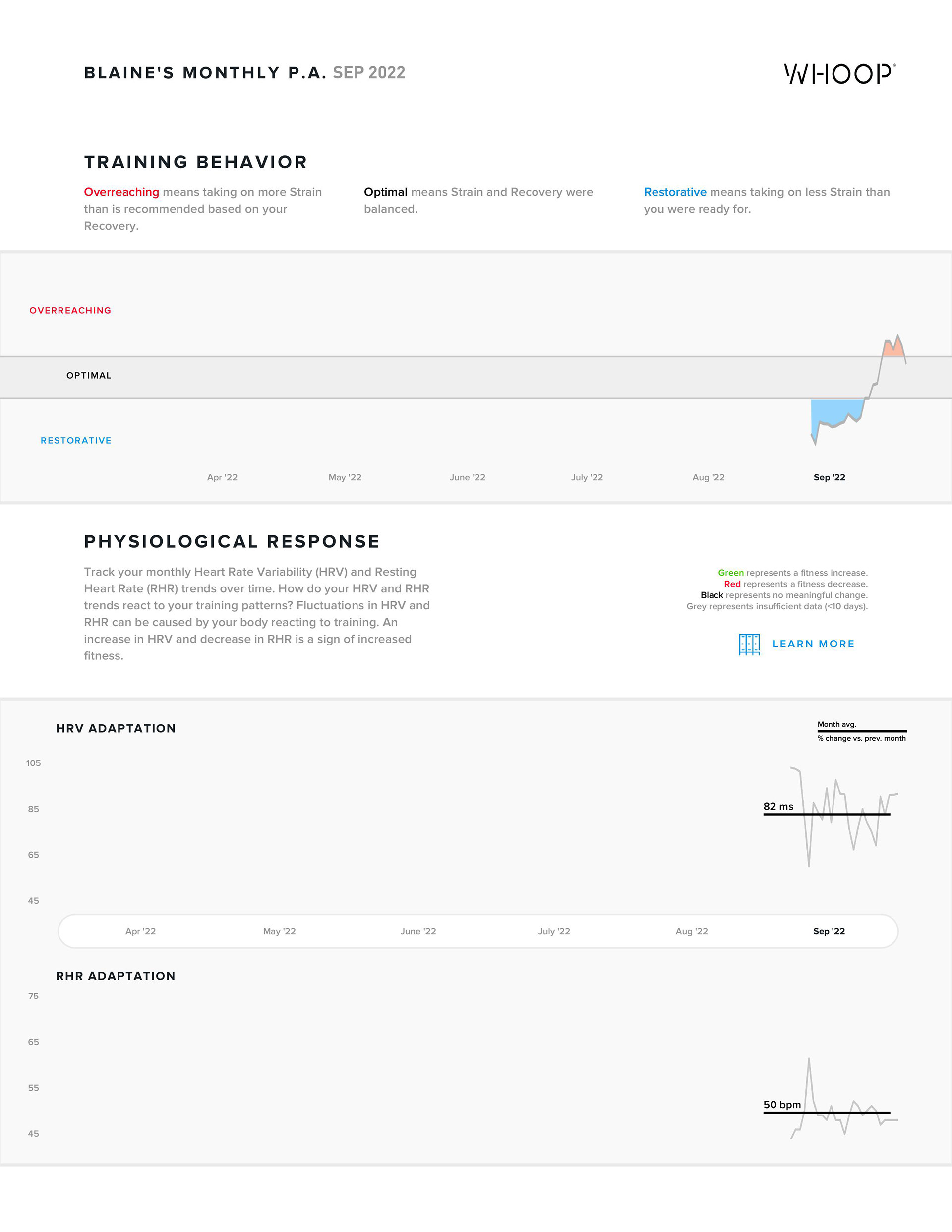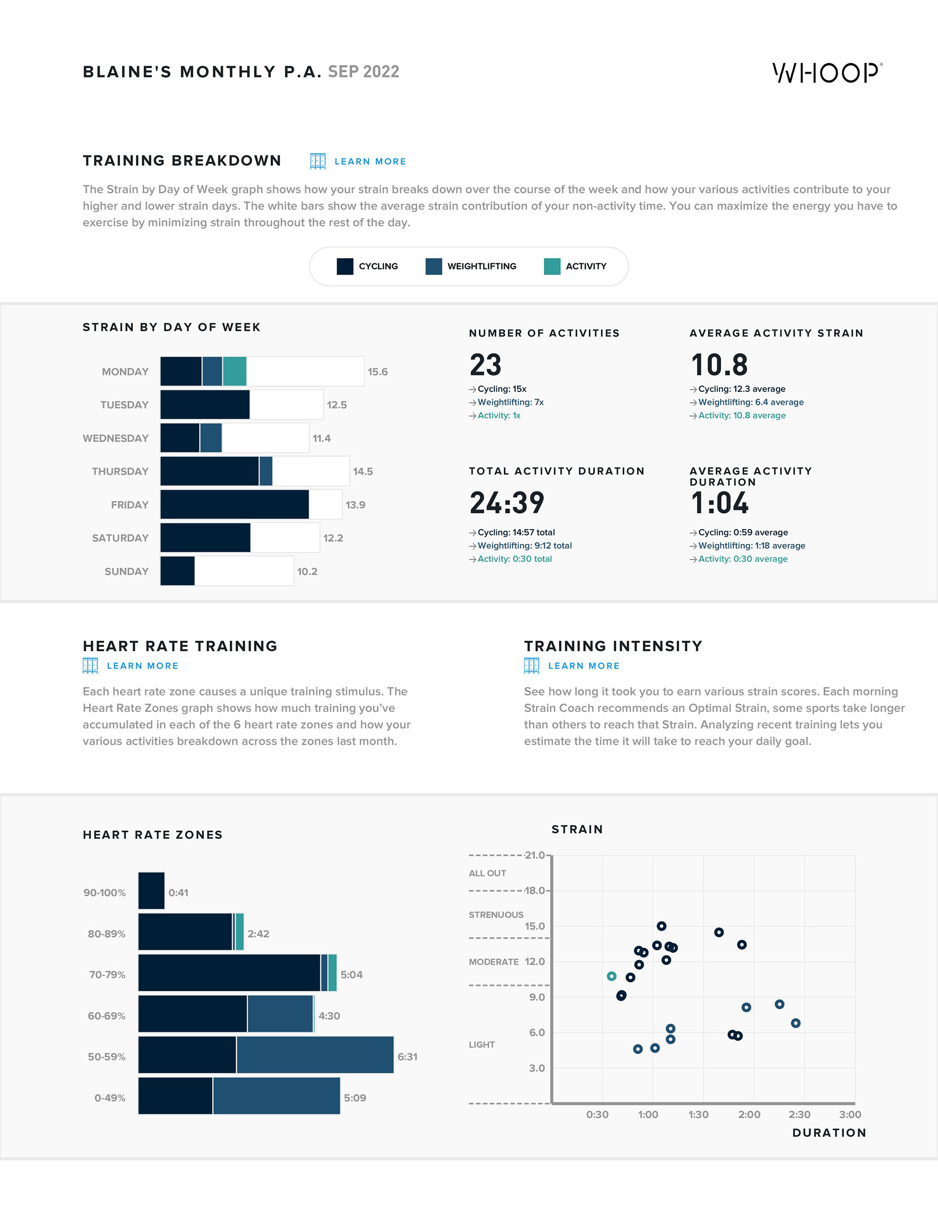 Here's where things get interesting. If you've managed to read through my poorly articulated review so far then you've done well. Each month WHOOP generates a detailed report for you to you can identify trends. Below is my first monthly report from the WHOOP 4.0