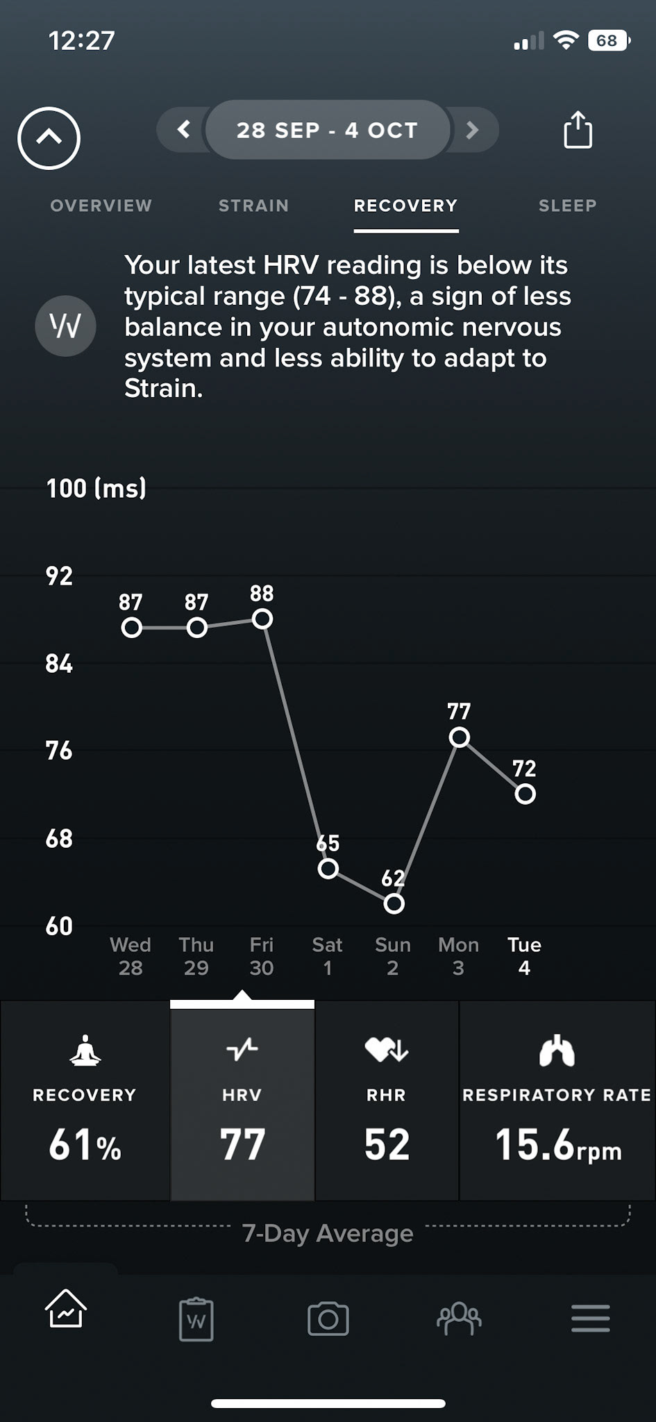 Here you can see the main dashboard. As we have discussed above my lack of sleep is weighing down my recovery. Based on my recovery WHOOP 4.0 gives you an optimal amount of strain for the day. You can set the band to vibrate when you reach this for the day to make sure you don't overcook yourself. Or you could go past your optimal strain for the day and overreach. You might have a rest day the next day to fully recover. As I said above it's not an exact science, it's an indication and allows you to get a picture of your trends and current status.